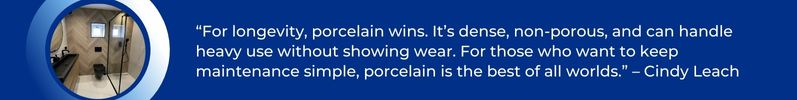 Cindy explains, “For longevity, porcelain wins. It’s dense, non-porous, and can handle heavy use without showing wear. For those who want to keep maintenance simple, porcelain is the best of all worlds.”
