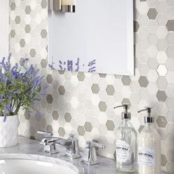 The detail and patterns within the floor can emerge through the optical illumination of hexagonally-shaped backsplash tile. The same can be said when applied to the floor, adding a modern, sophisticated edge.