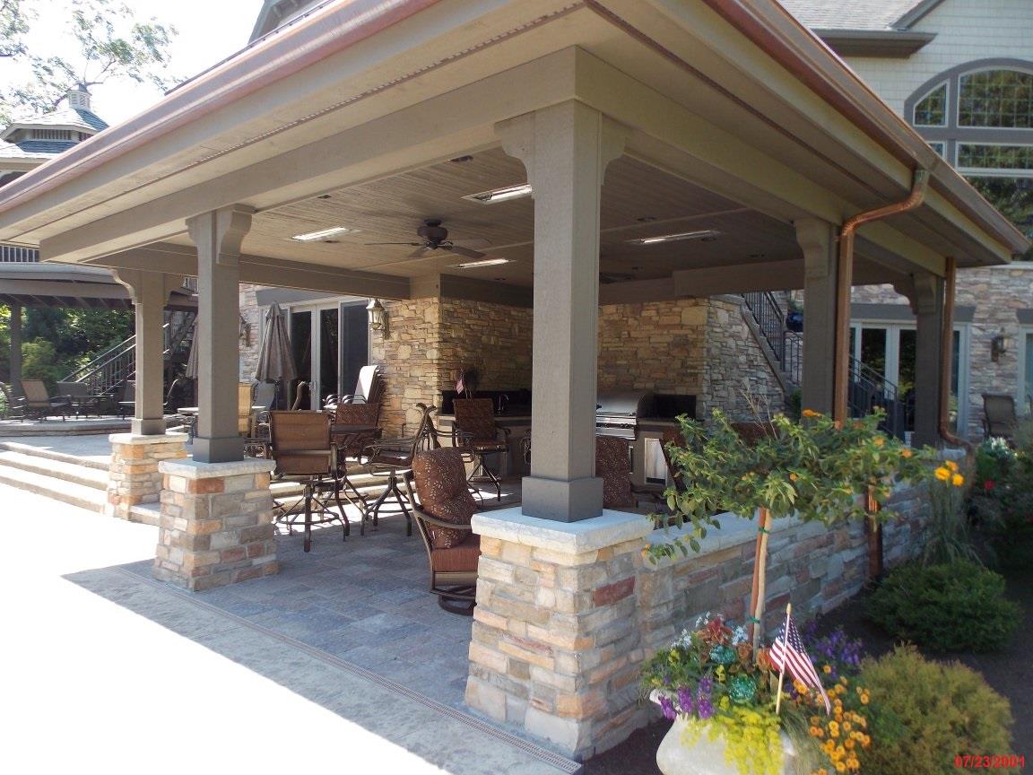 Stone walls and stone tile flooring add a rustic quality to this outdoor kitchen and dining space.