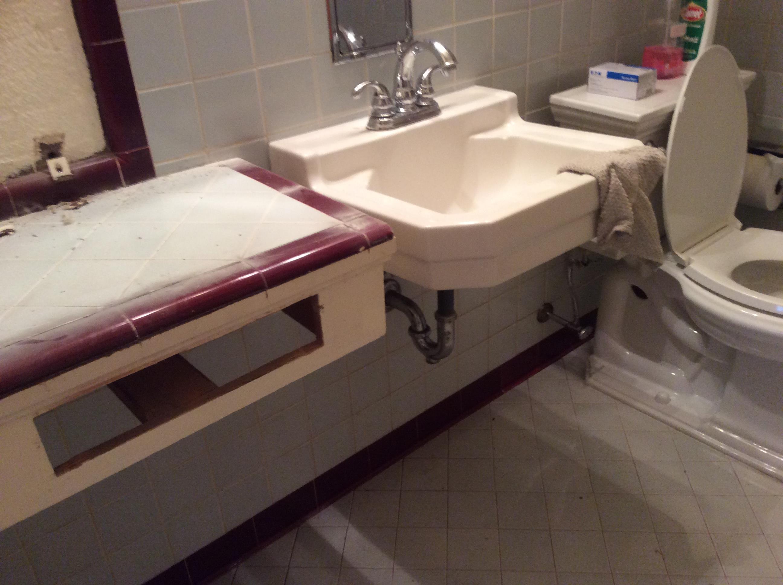 Stainless fixtures unify tile walls, herringbone floors and marble countertops in this guest bath to create a distinguished traditional design.