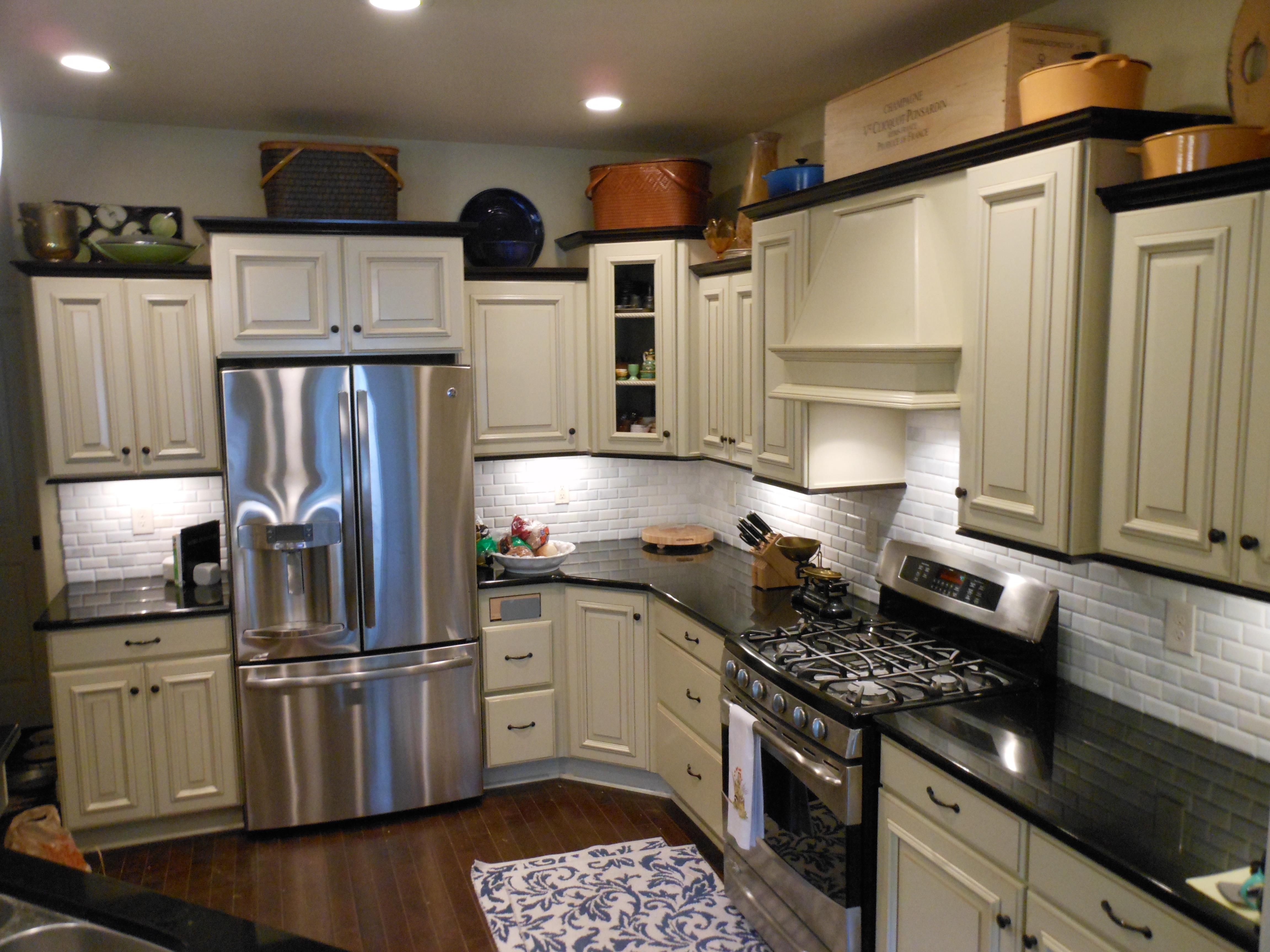 Our client wanted a bright and cheerful kitchen so they chose ivory colored cabinets with a white marble tile splash. The black granite countertop offers a sharp contrast and helps accent the cabinets along with the black crown molding.