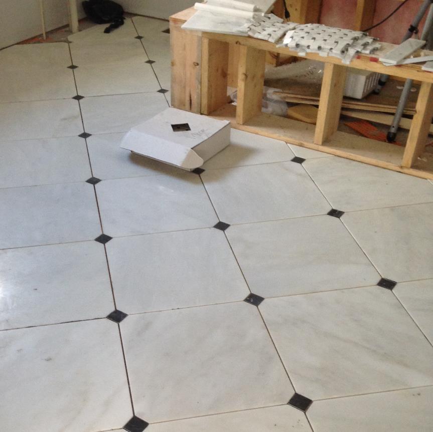 Our customer wanted a black, white and gray color scheme. The bathroom was all done in Carrara marble with black accents. The basket weave was put on the shower wall to accent the curved doorway into her large shower, and to break up all the large tile on the walls.