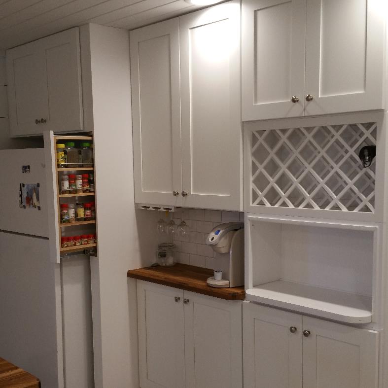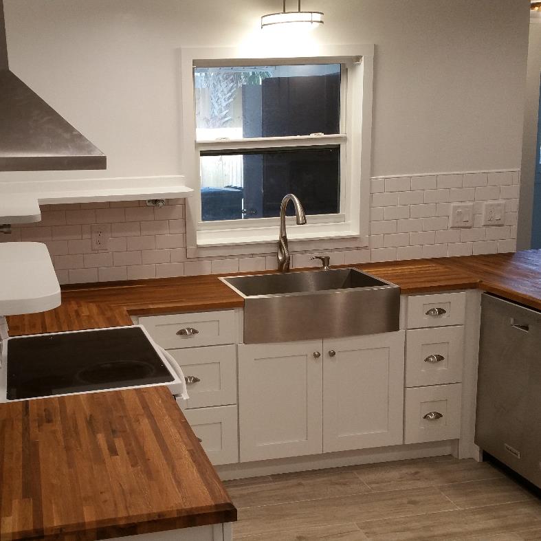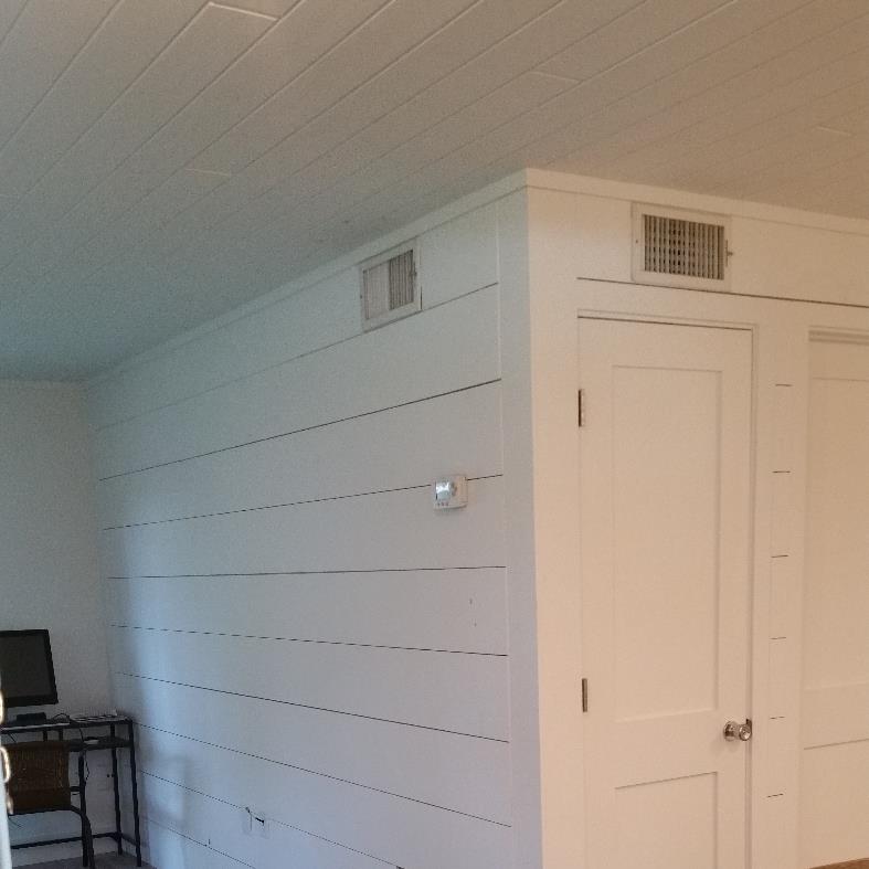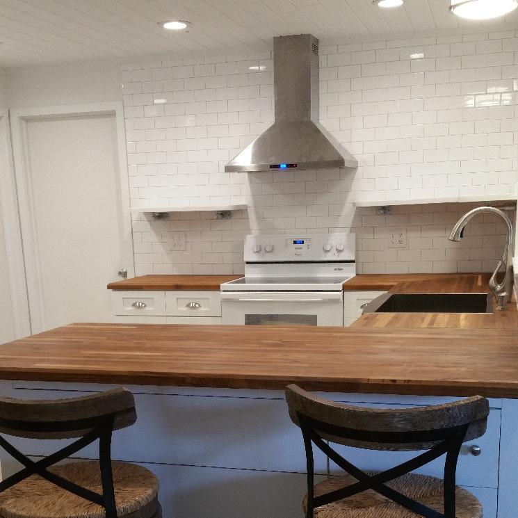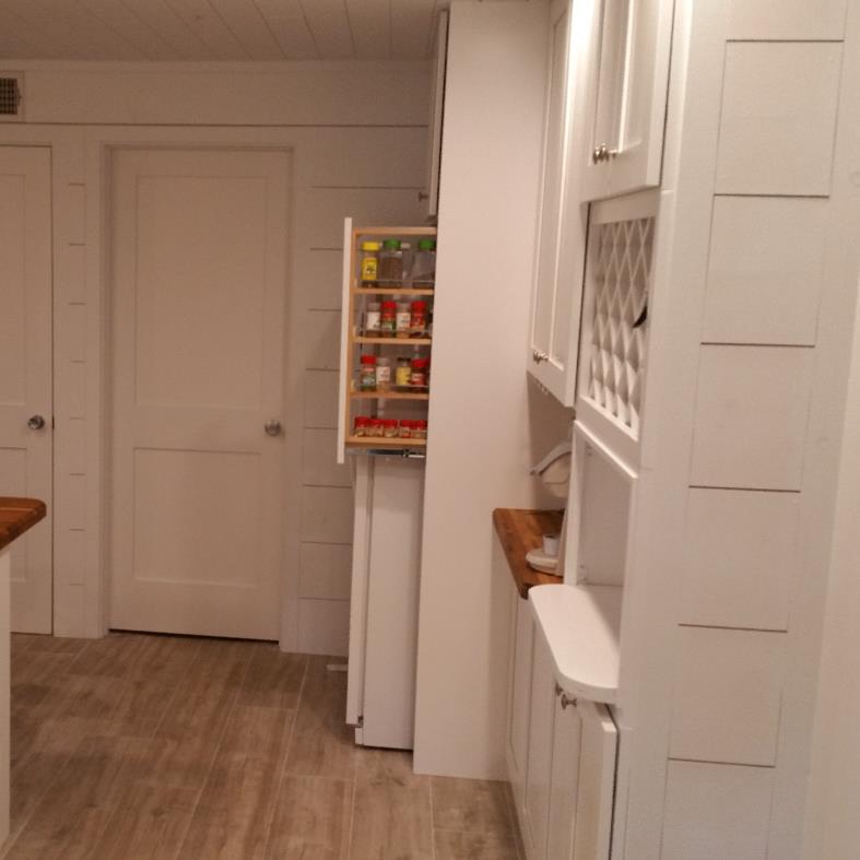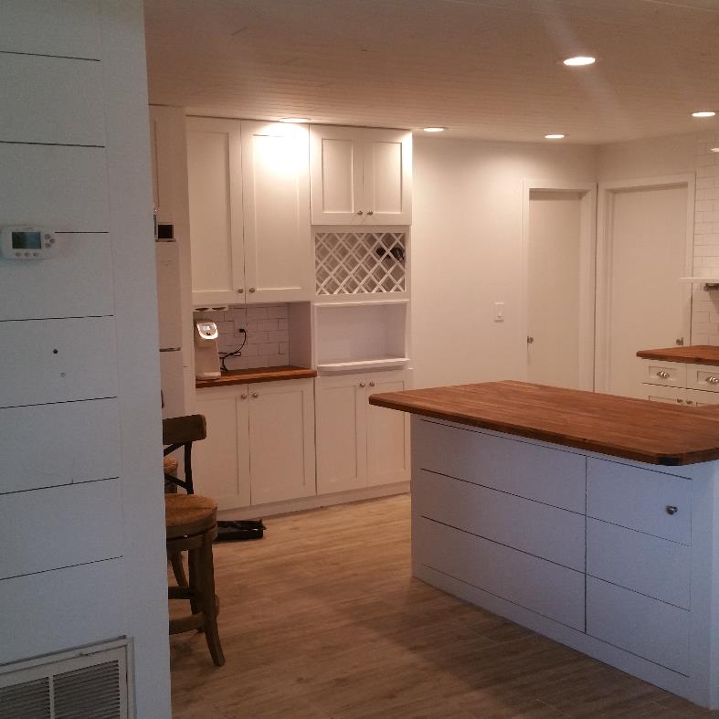 Small cottage flare. White shaker cabinets with butcher block countertops. Shelves in the kitchen with a little industrial touch. Wood plank tile throughout the cottage. Ship lap on 2 walls and a hidden storage area under the backside of the bar. Tongue and groove on the ceiling as well.