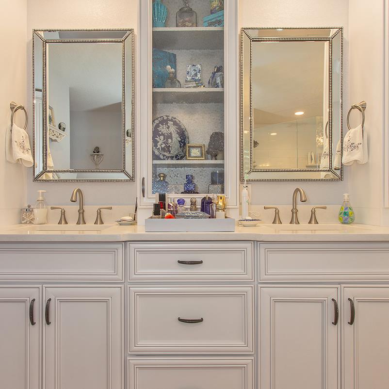 Interior Renovations: Custom cabinetry w/ antique glass, quartz counter tops, plank tile flooring, wall tile w/ glass tile accent, updated door casing- base boards- wood window sills, custom glass shower enclosure, floating bench seat & shelving, custom mirrors, Jacuzzi tub w/ inline heater, Modern contemporary plumbing & electrical fixtures, add dividing wall w/ door (separate bedroom from bathroom), framing- drywall- painting, raise concrete sub-floor (where existing tub removed) www.goldenconstructionfl.com/