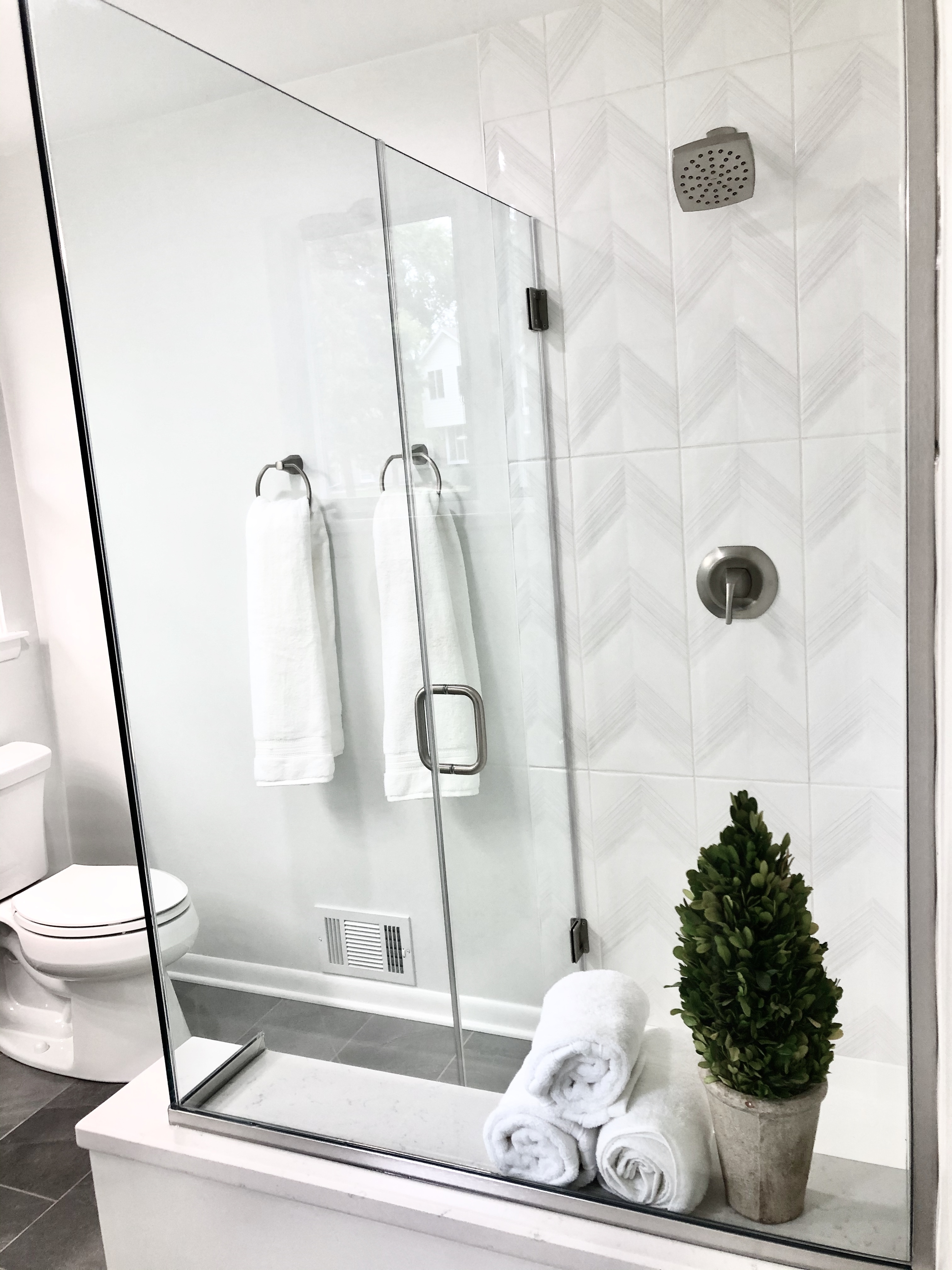 In this Primary Bathroom update, the design implemented a fun yet subtle 12x24 tile installed vertically. The shower doors wrapping around the corner create a spa like feel to this bathroom renovation.