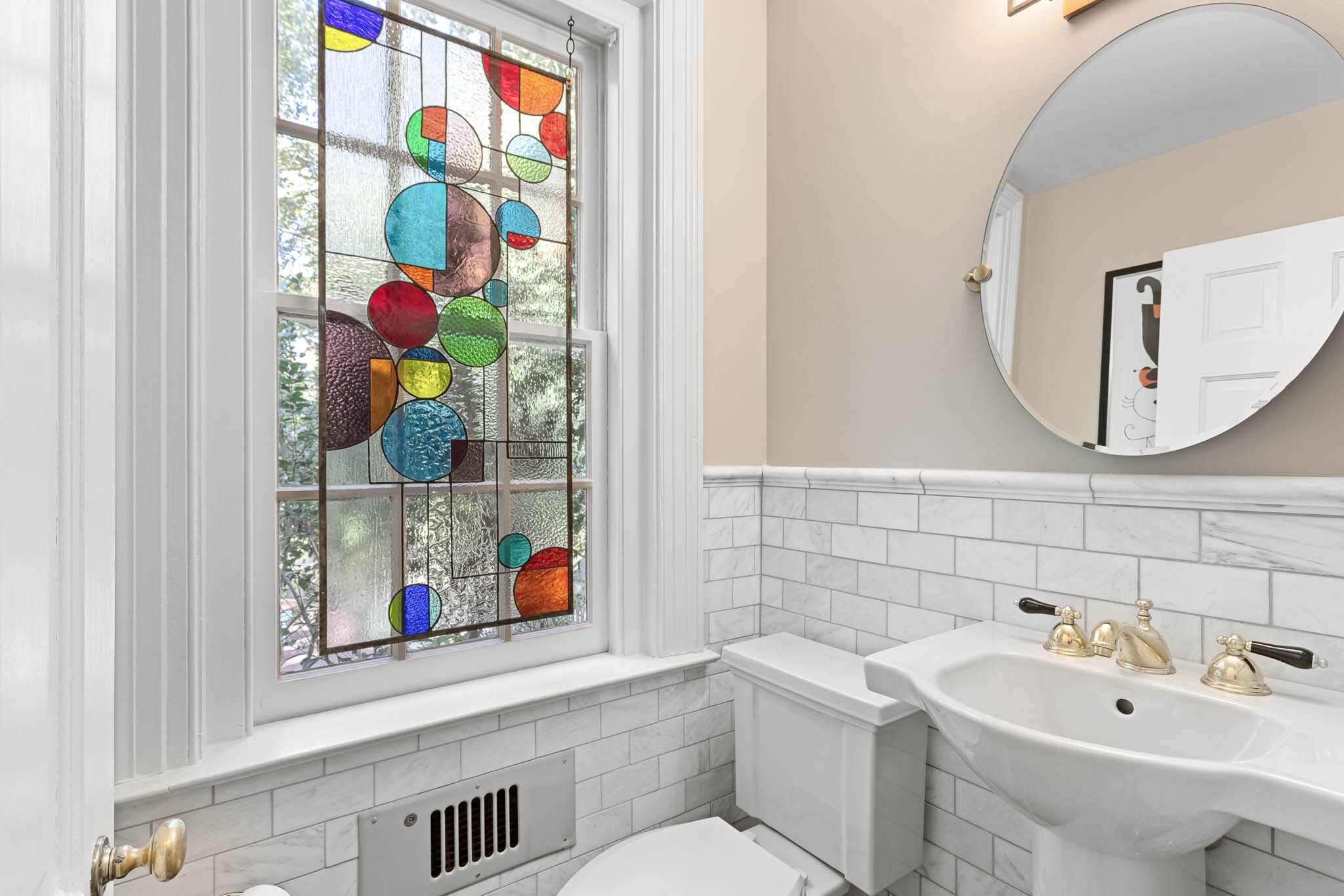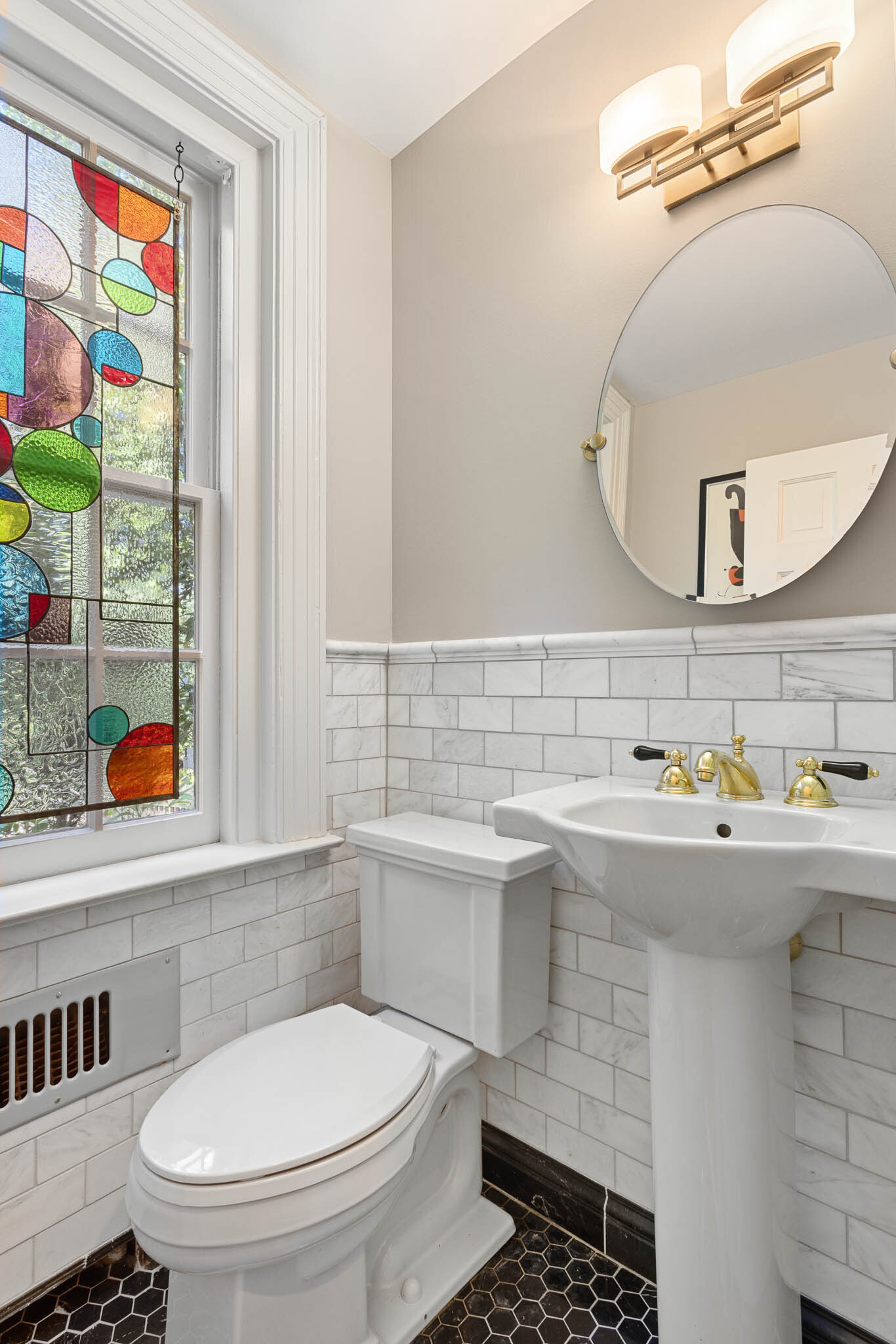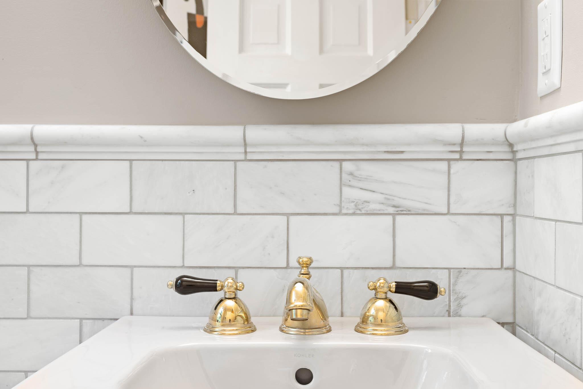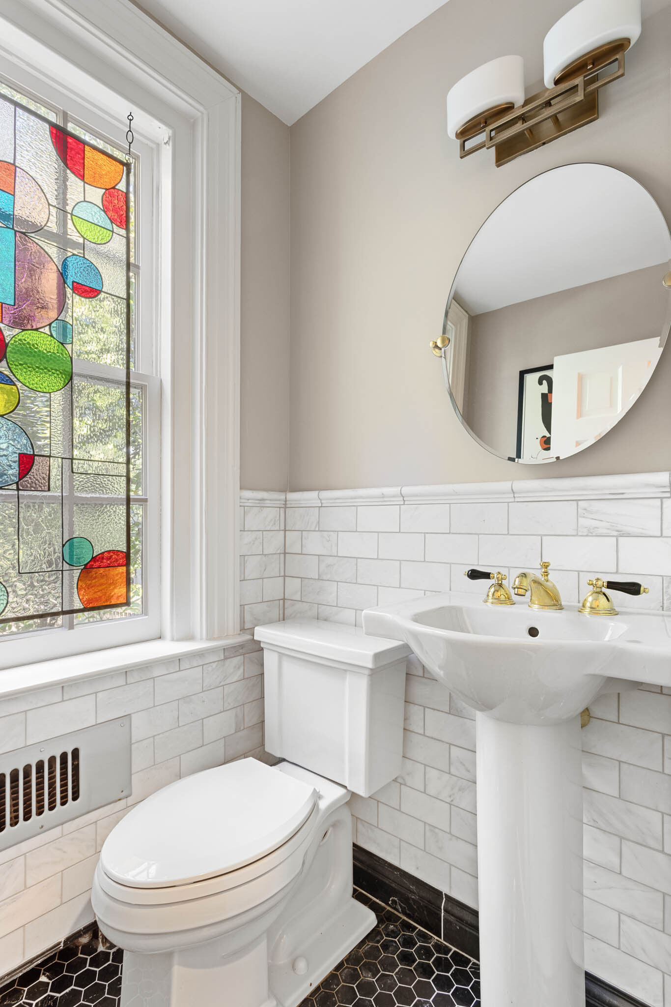 This dated bathroom got a refresh in black and white marble with a traditional grey toilet and sink and an updated neutral palette.
