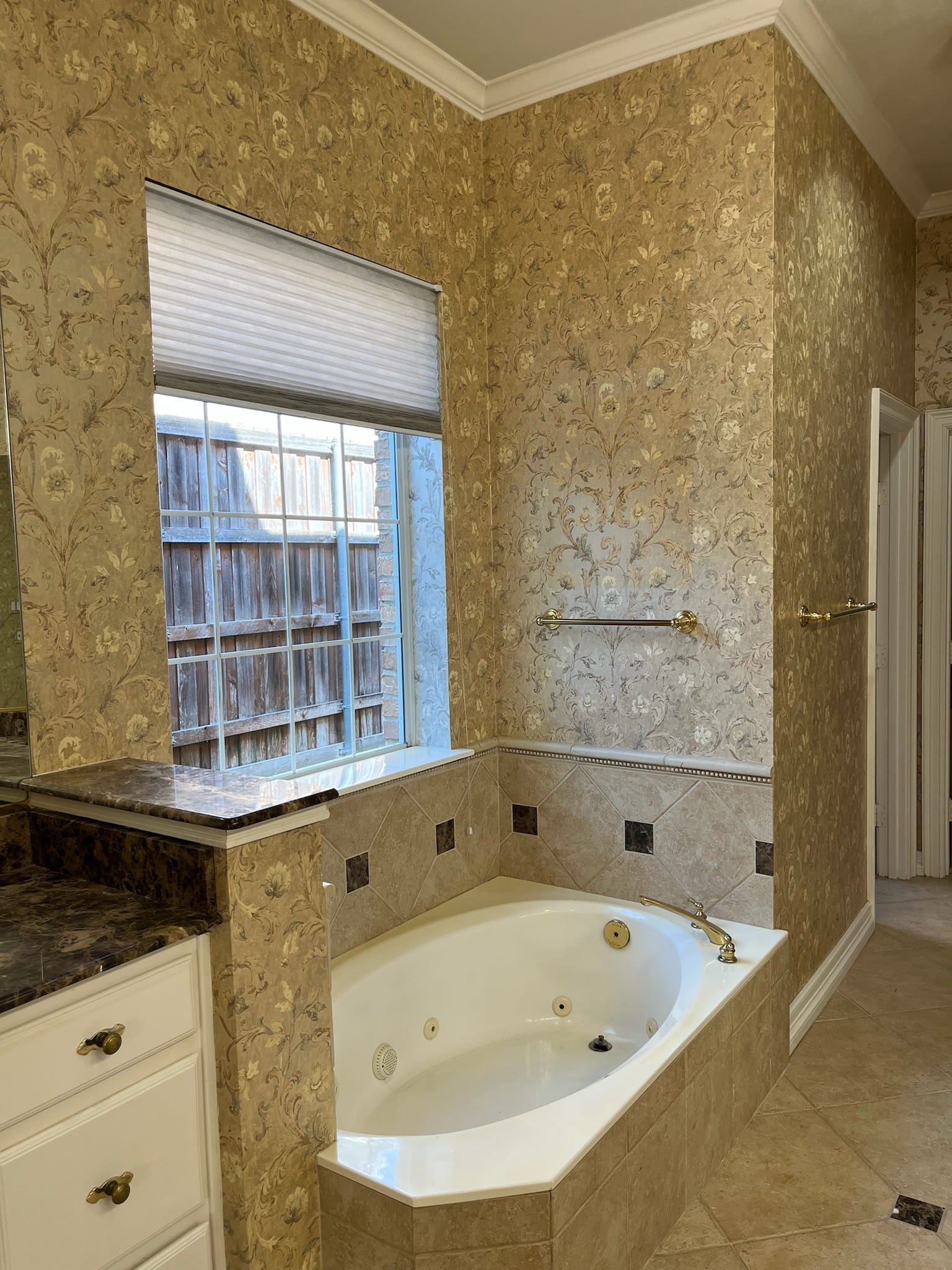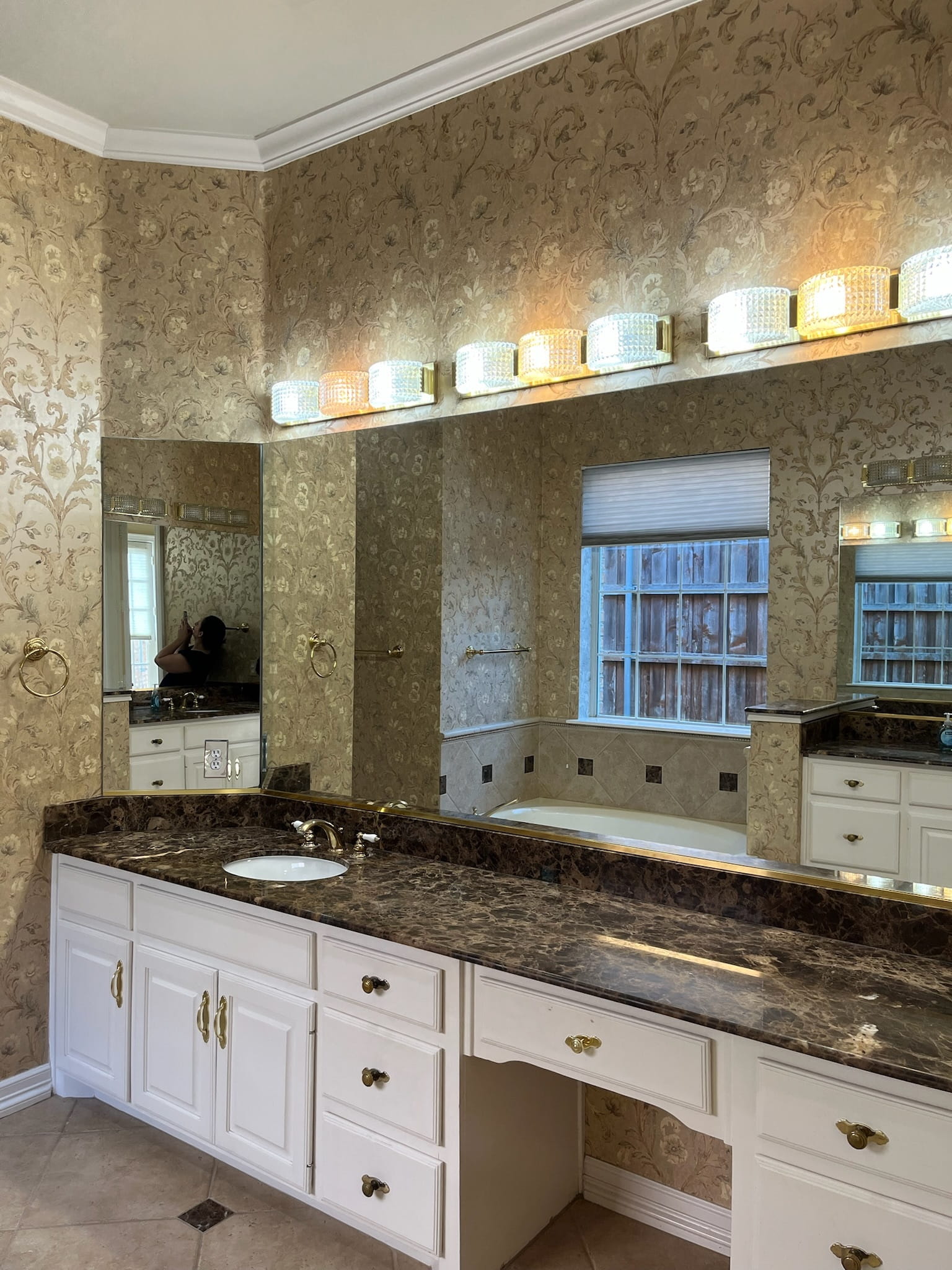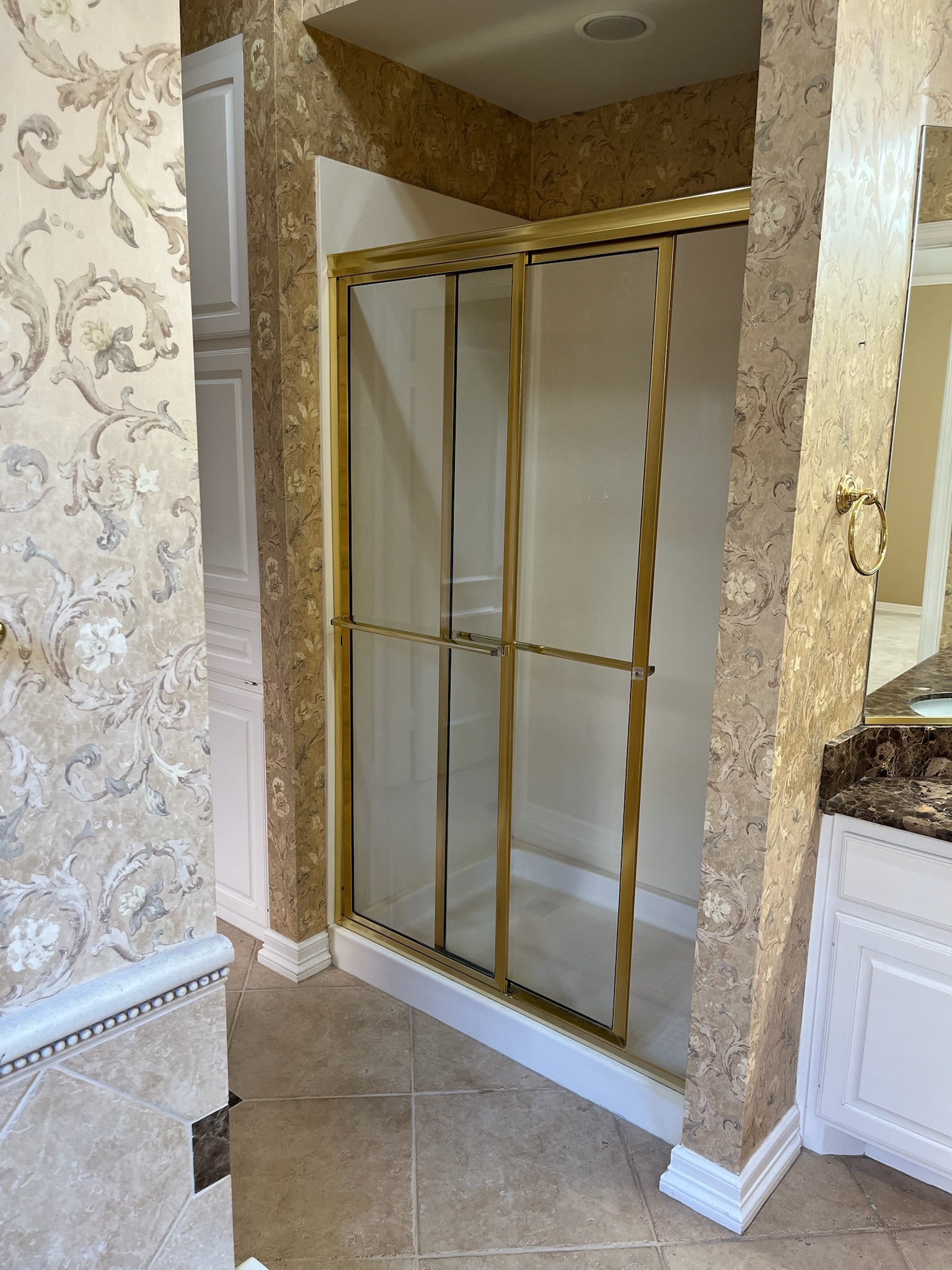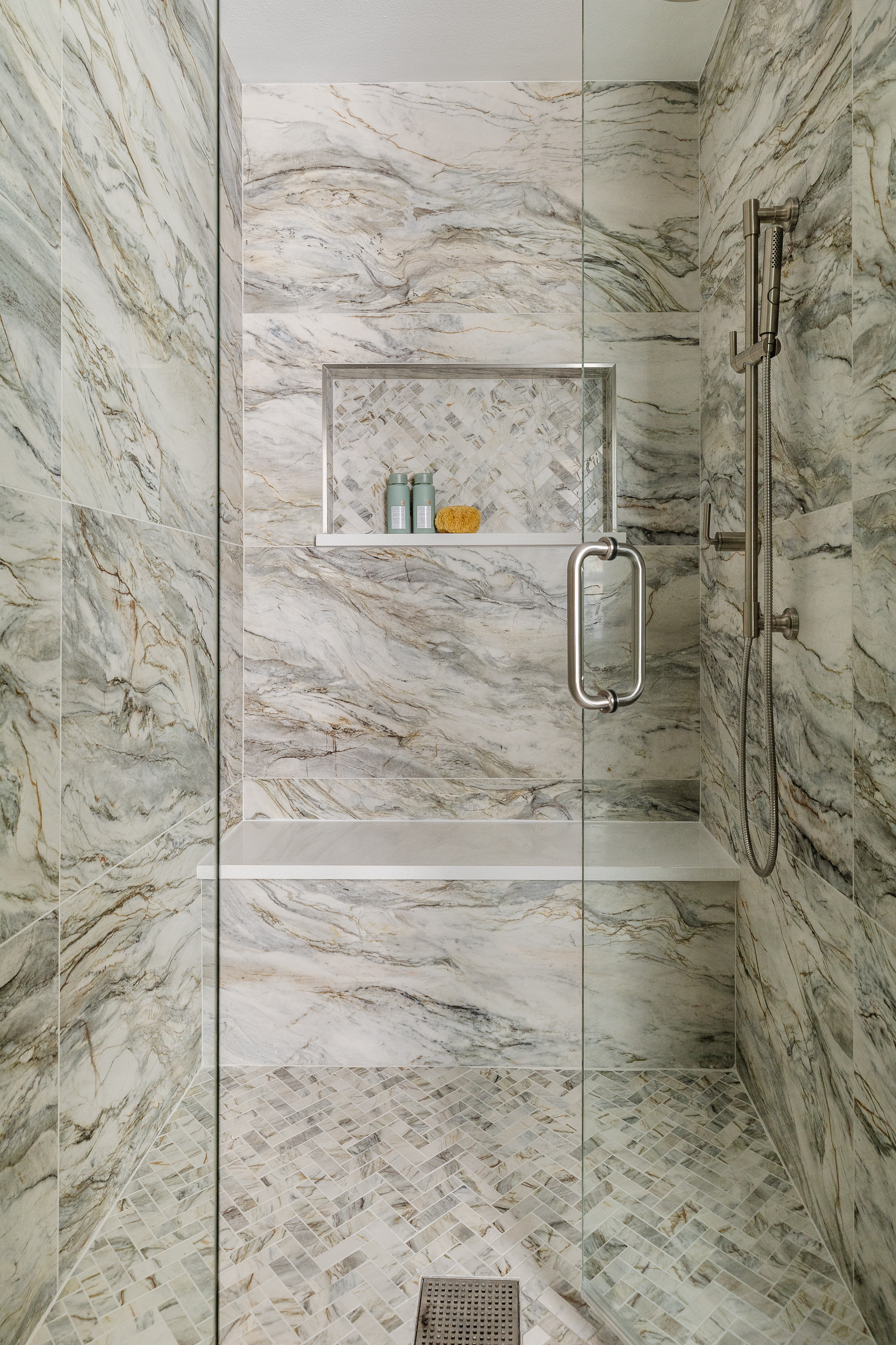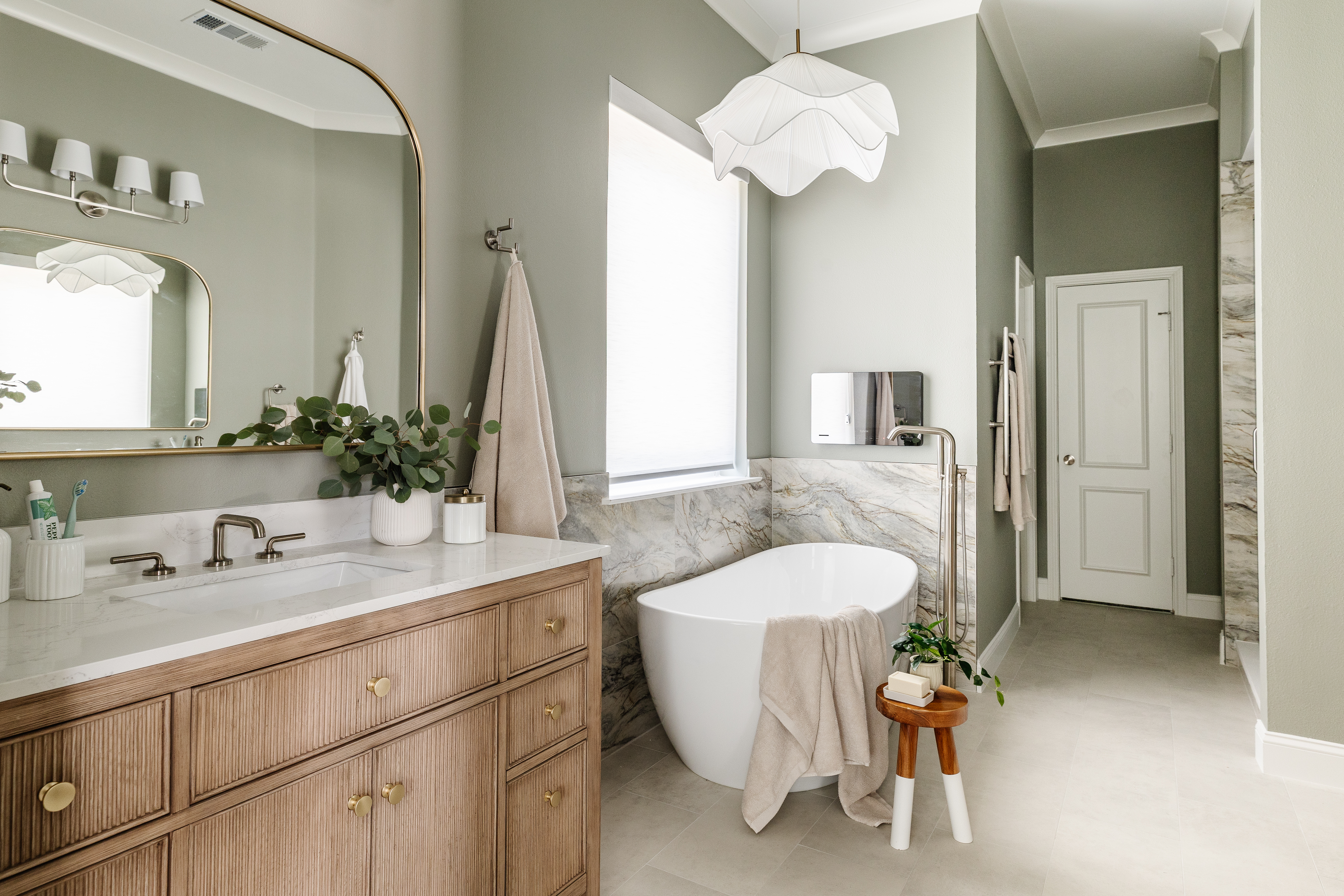 A narrow, outdated bathroom was reimagined as an open, organic spa retreat that continues the home’s biophilic aesthetic. By discovering a hidden hallway closet behind the shower wall, we were able to expand the shower—unlocking a client wish we initially thought wasn’t possible. Smaller prefab vanities, a freestanding tub, and brushed nickel fixtures created a lighter, airy layout, paired with Bedrosians tile, a towel warmer, a chandelier, and a mirror TV for added luxury and functionality.