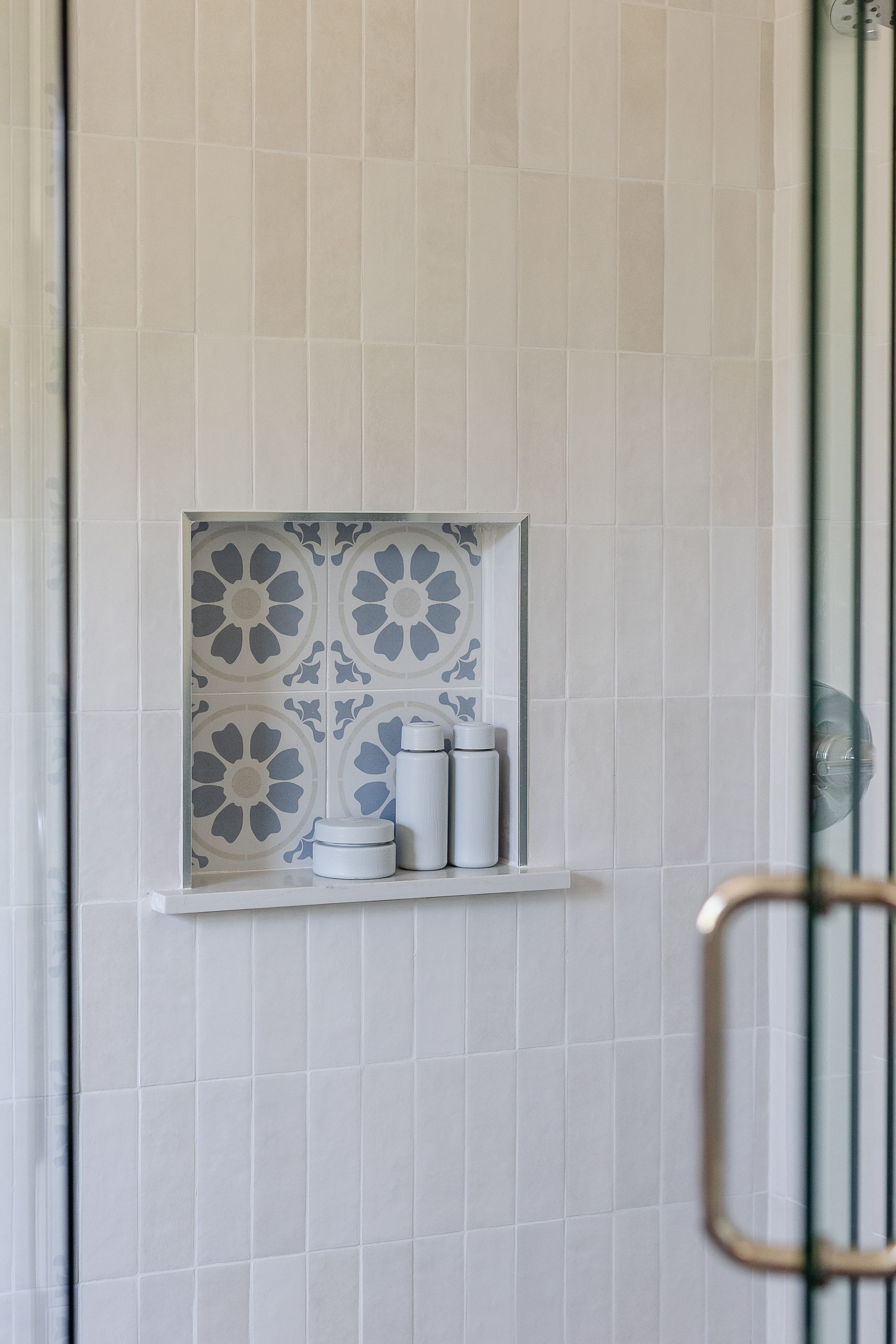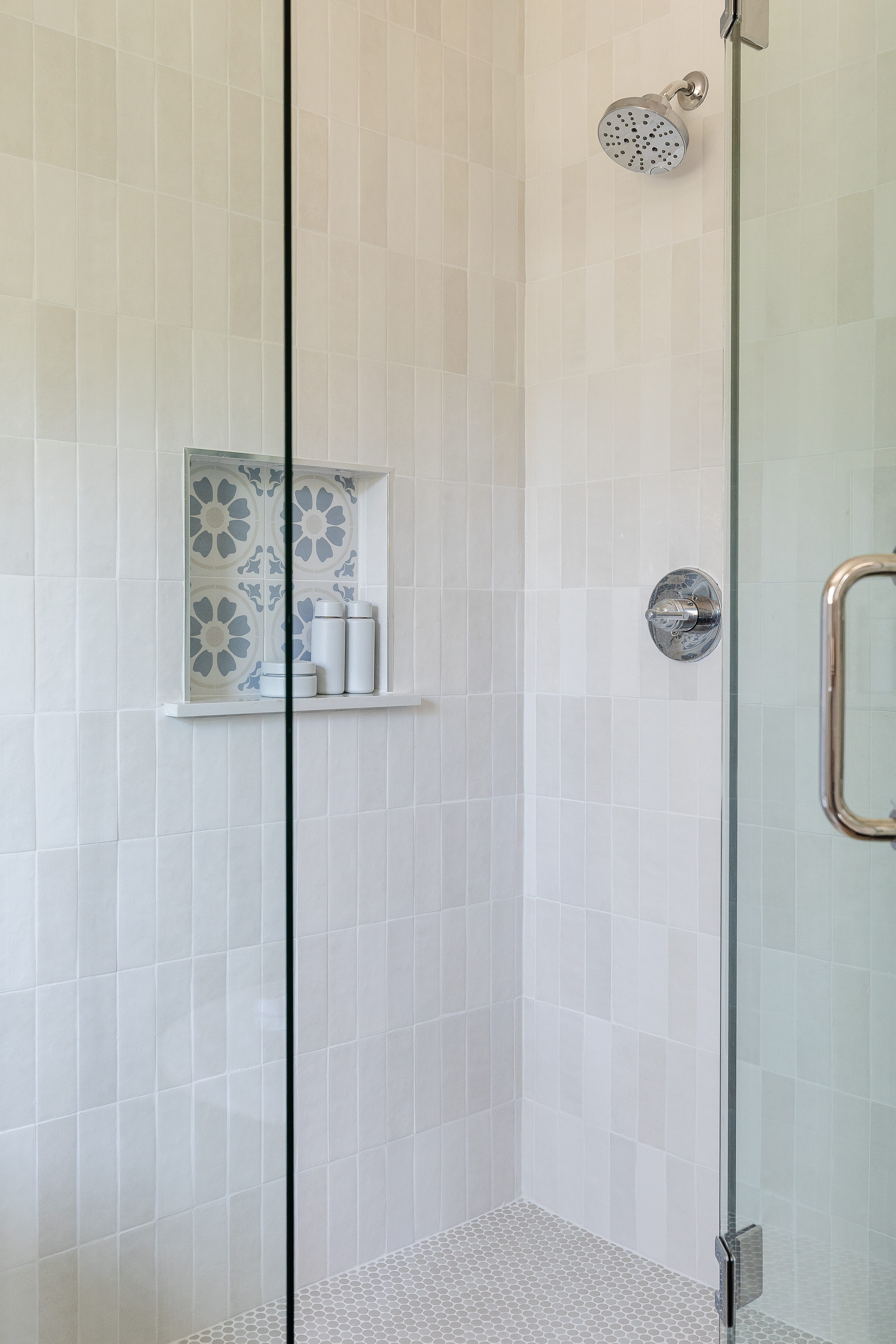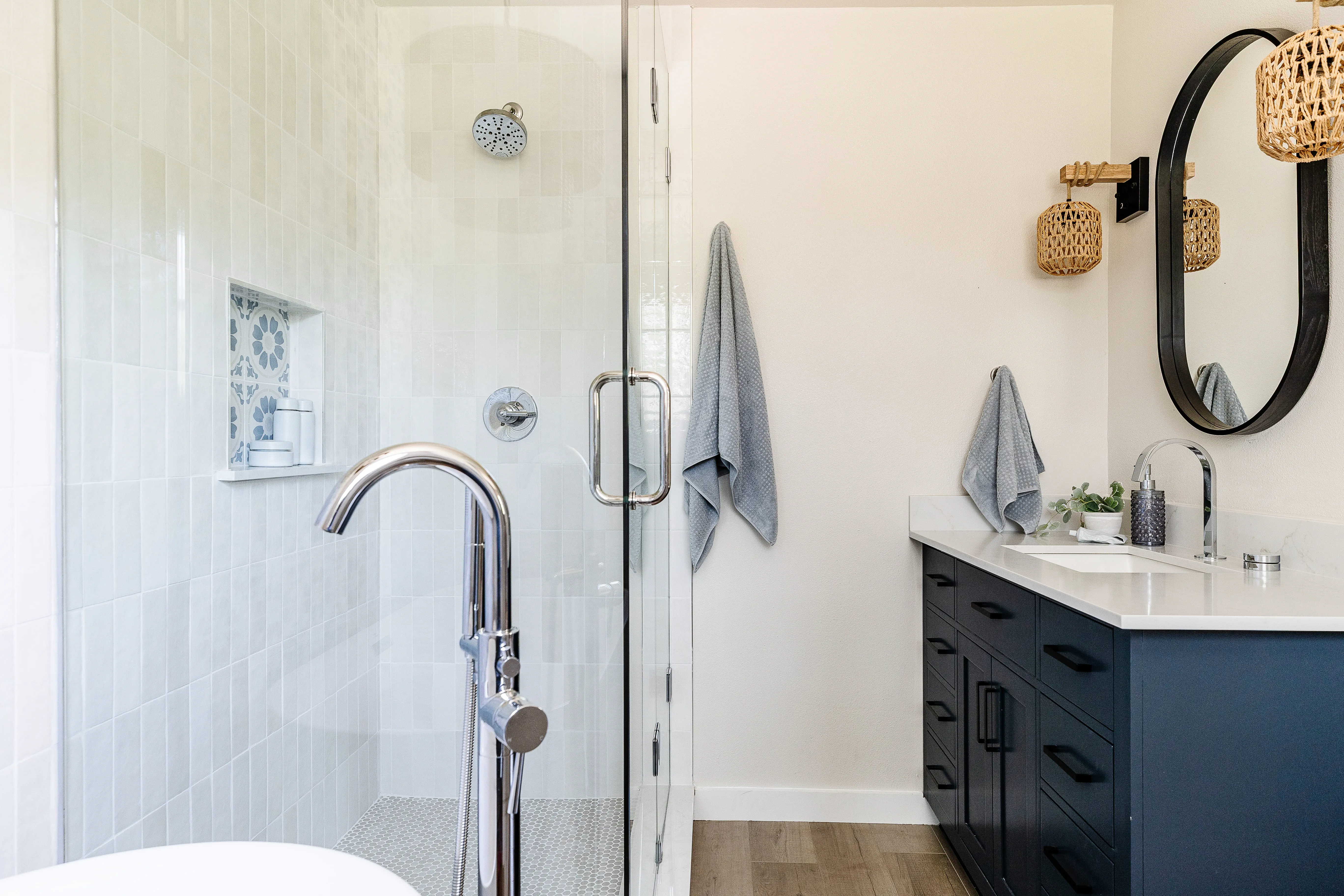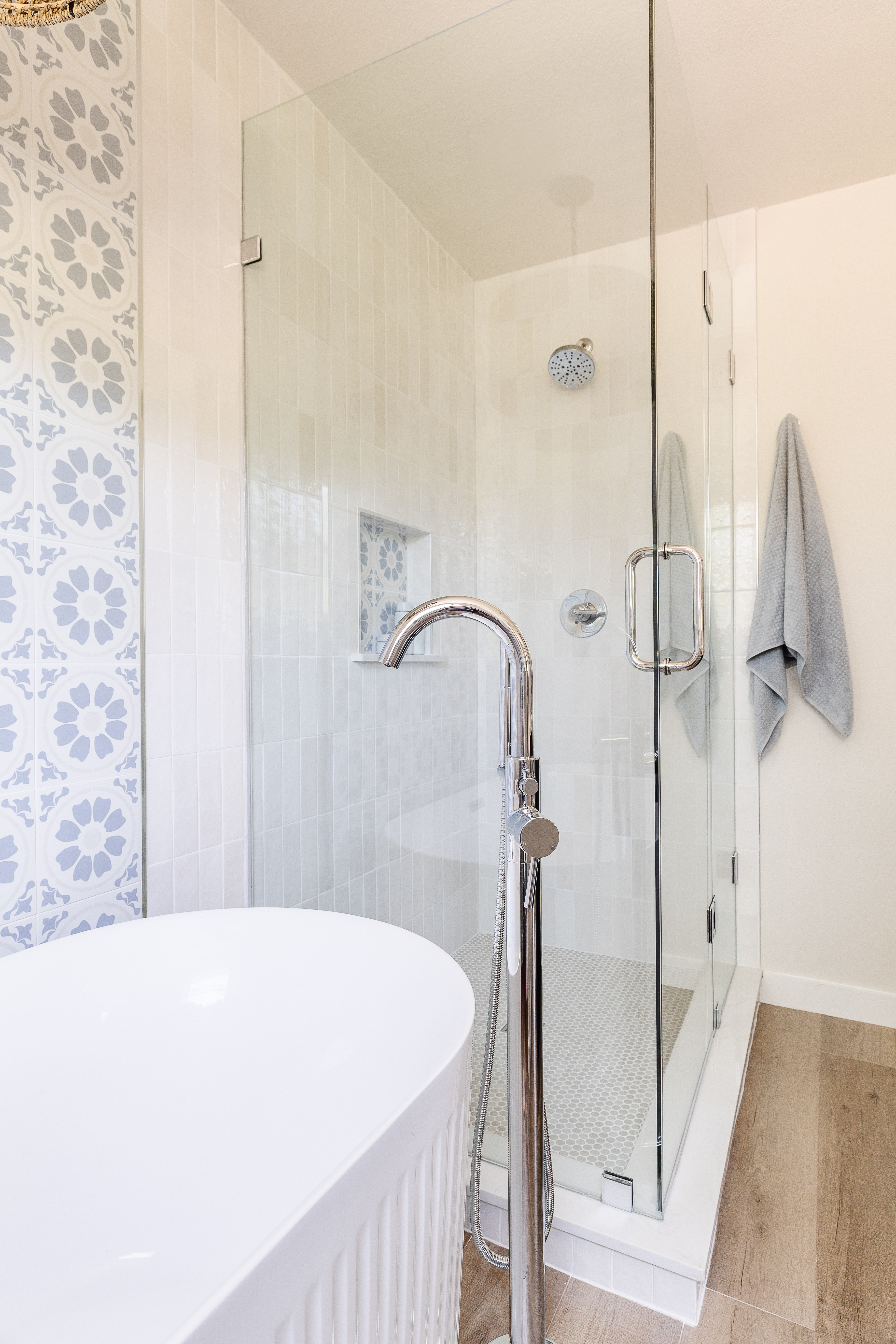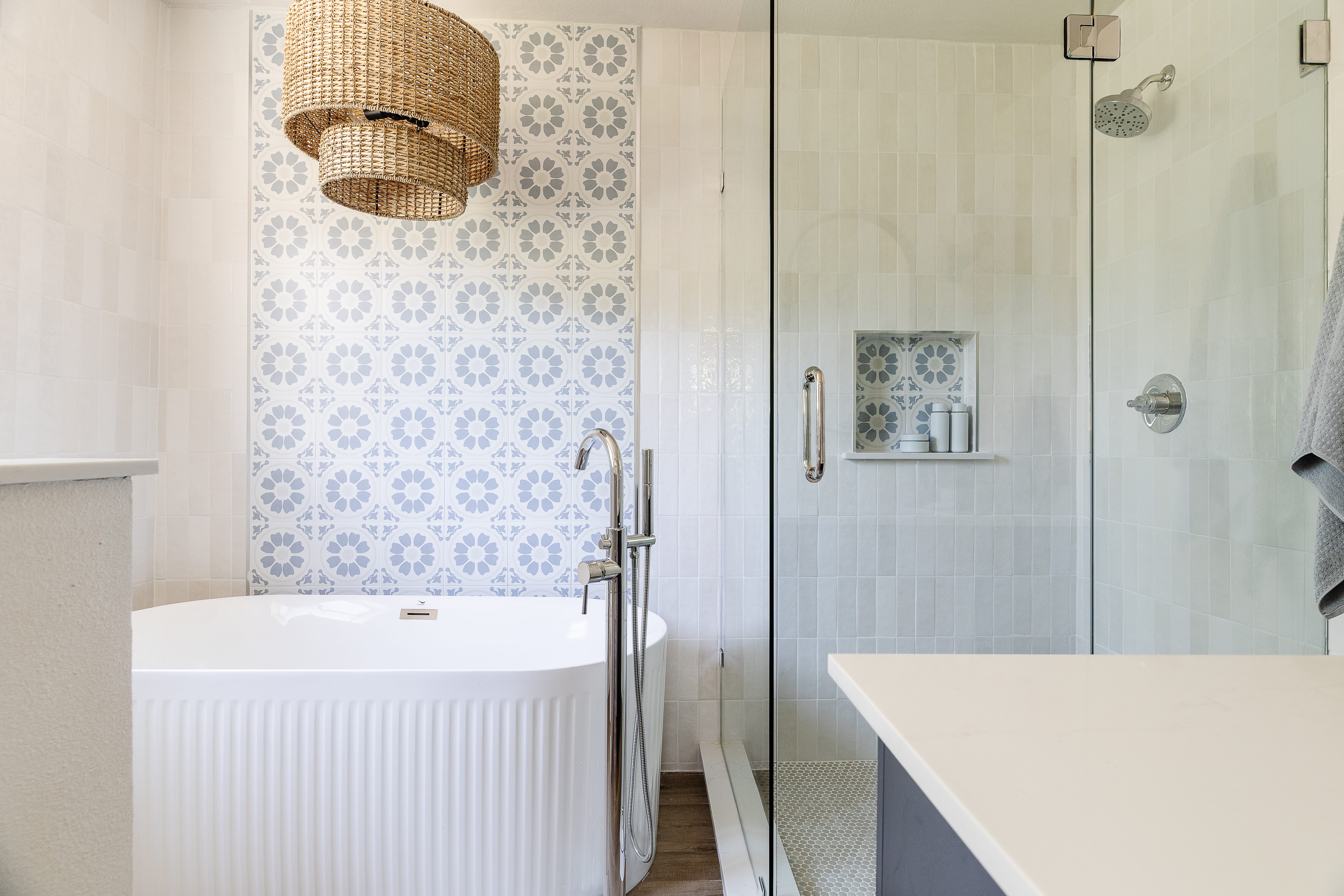 With just five weeks and under $25K, this master bath was transformed into a bright, spa-like retreat for a luxury lake rental. By borrowing space from a closet and removing an unused alcove, we added a freestanding tub, walk-in shower, and larger vanity. A floor-to-ceiling floral tile band creates a striking focal point, while prefab selections and smart storage kept costs down. The result feels twice as spacious and has become the rental’s most photographed room.