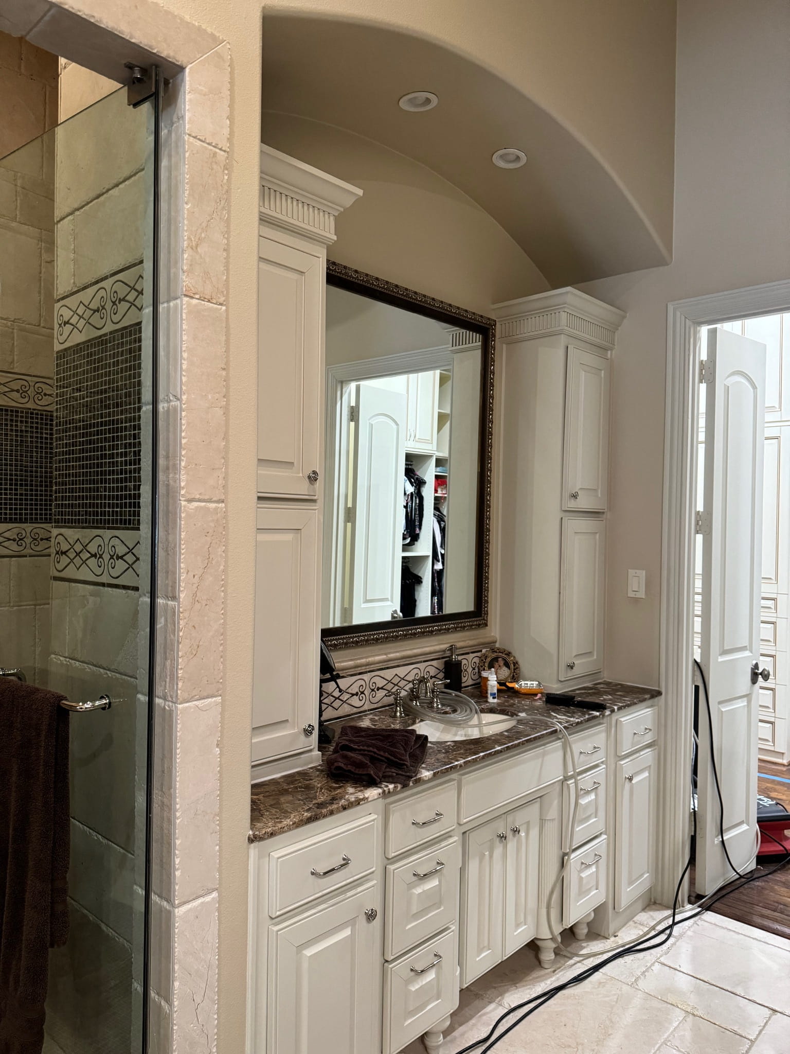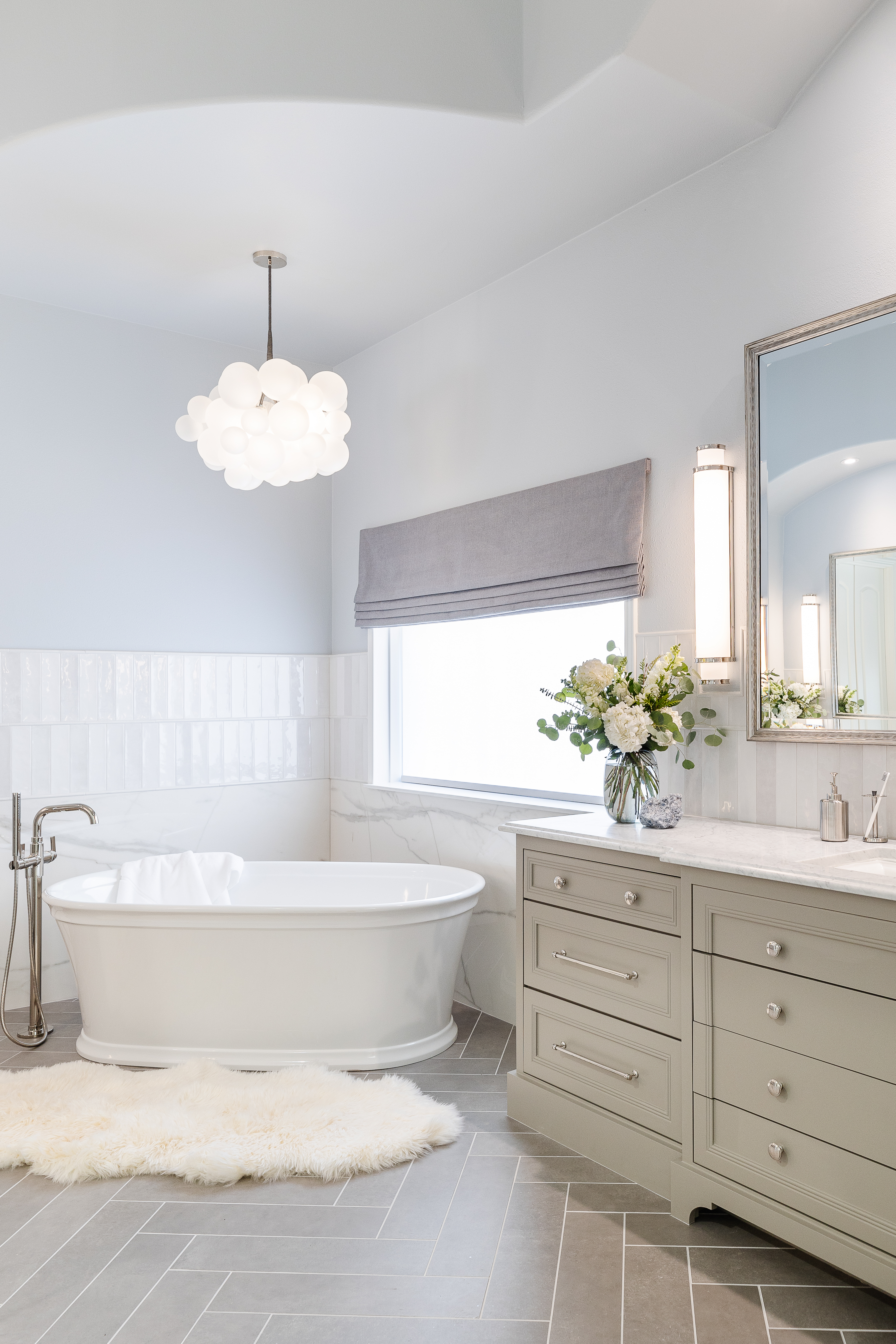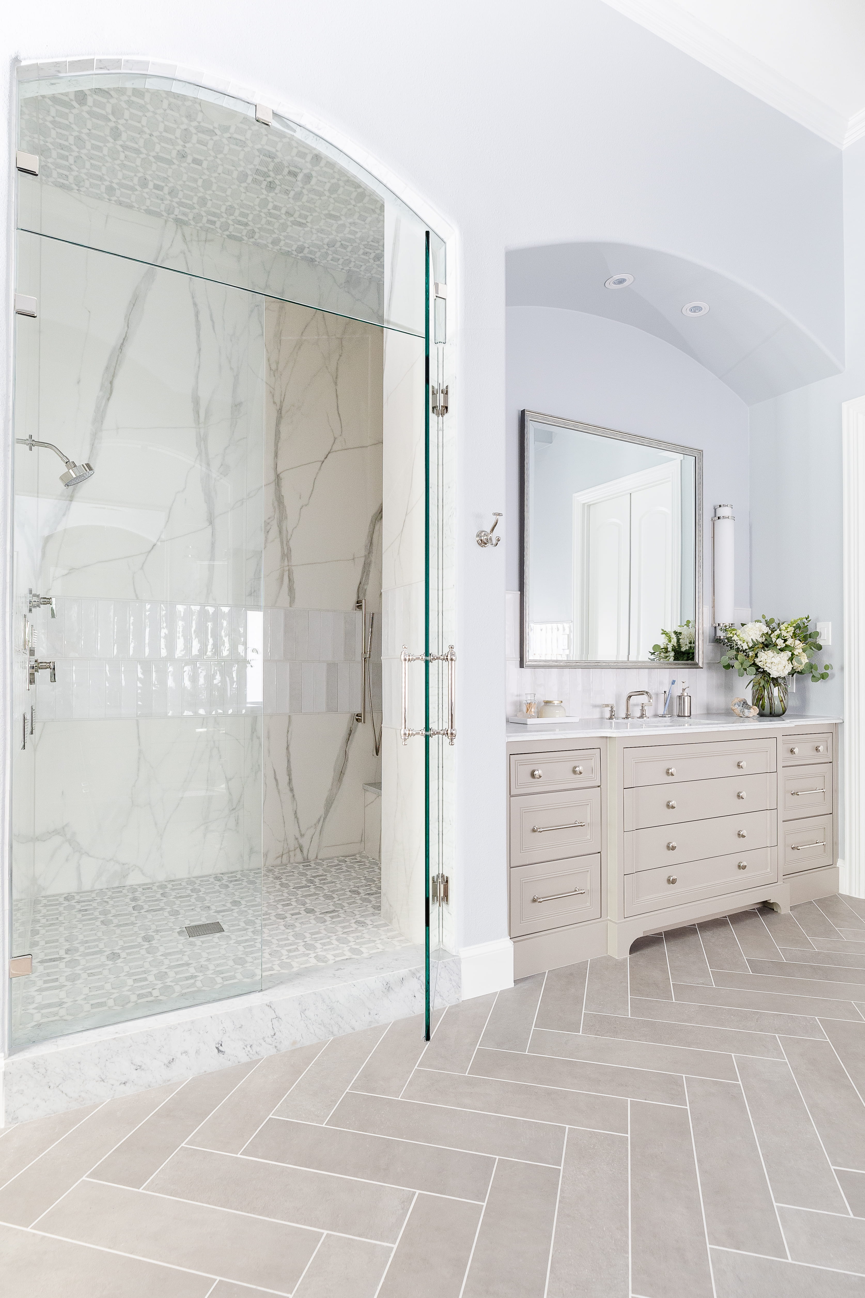 After a sprinkler flood, the primary bathroom was reimagined into a softly luxurious retreat befitting its prestigious neighborhood. The layout stayed, but every finish changed—replacing heavy Tuscan elements with polished porcelain walls, layered lighting, and calming tones. A custom arched shower entry and a continuous 24-inch zellige tile band made the oversized shower feel intentional, while a bespoke marble-topped vanity and a handmade bubble chandelier added tailored, artful elegance.