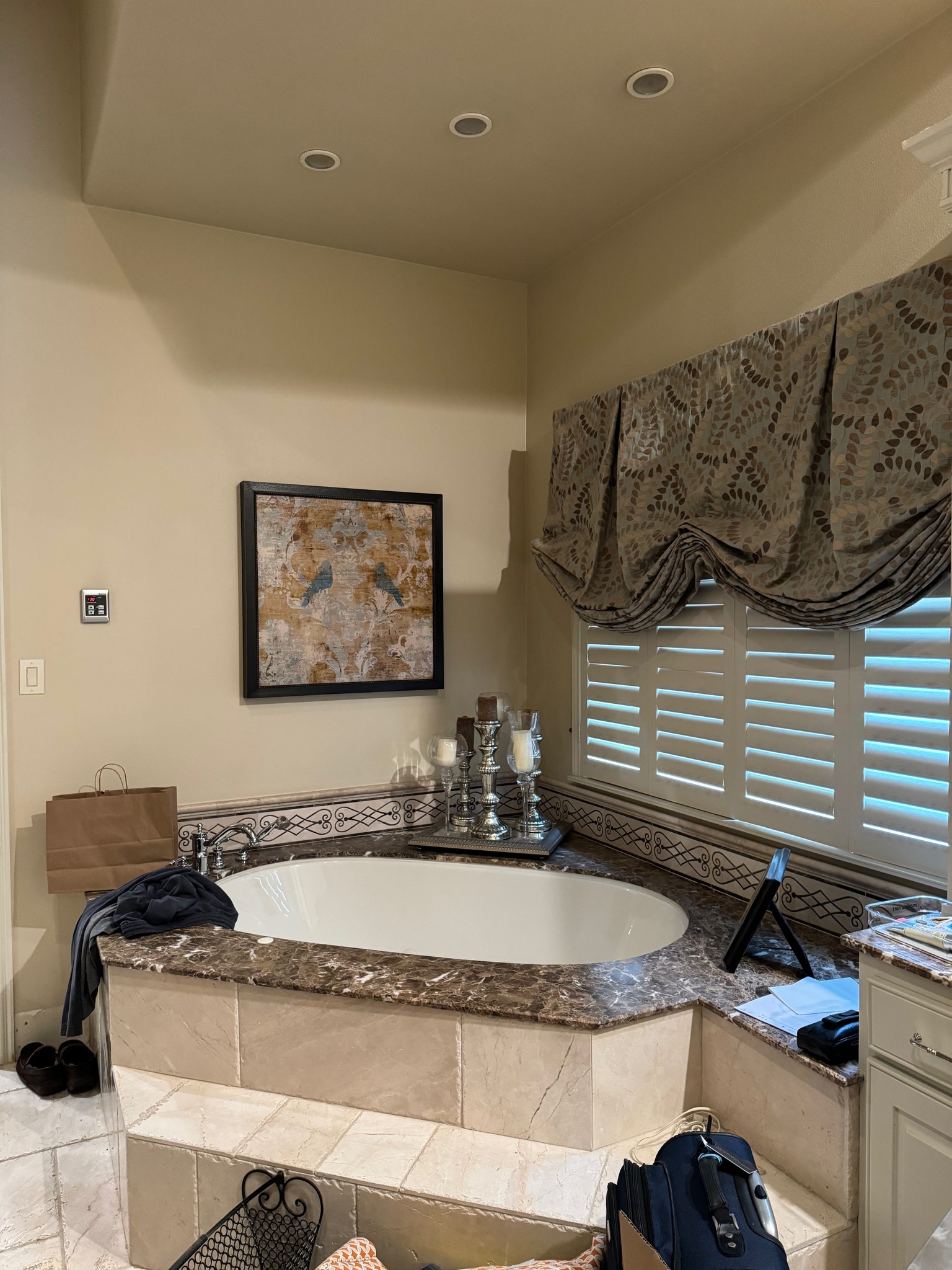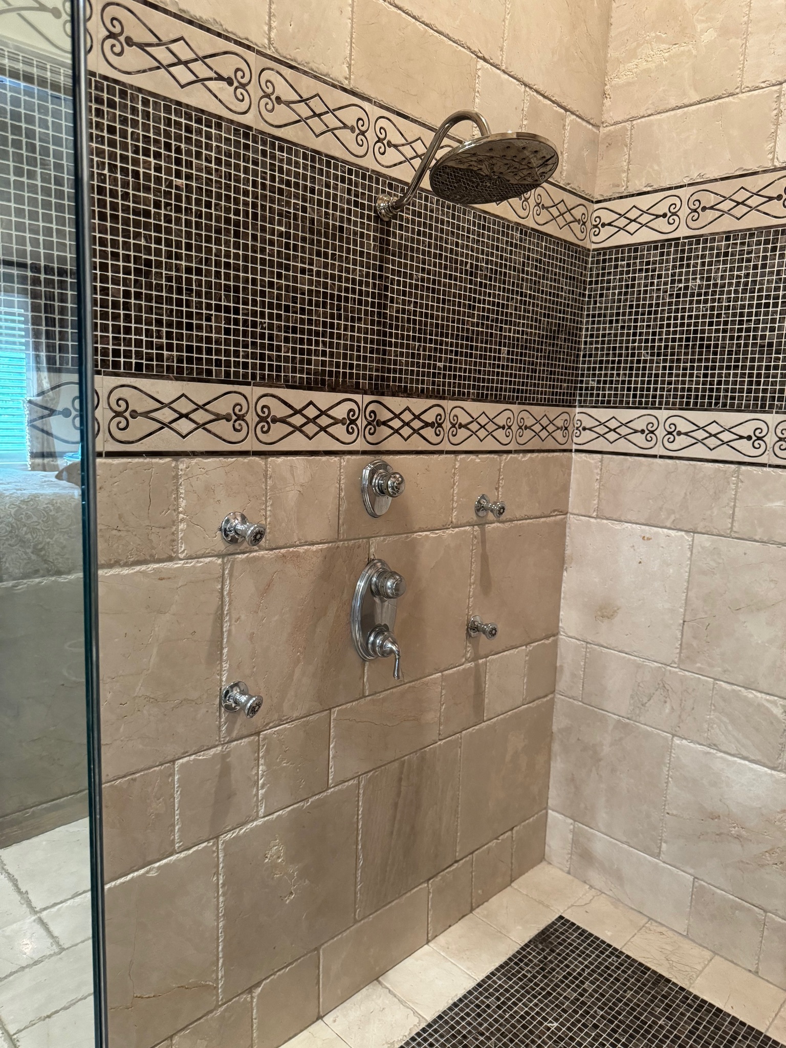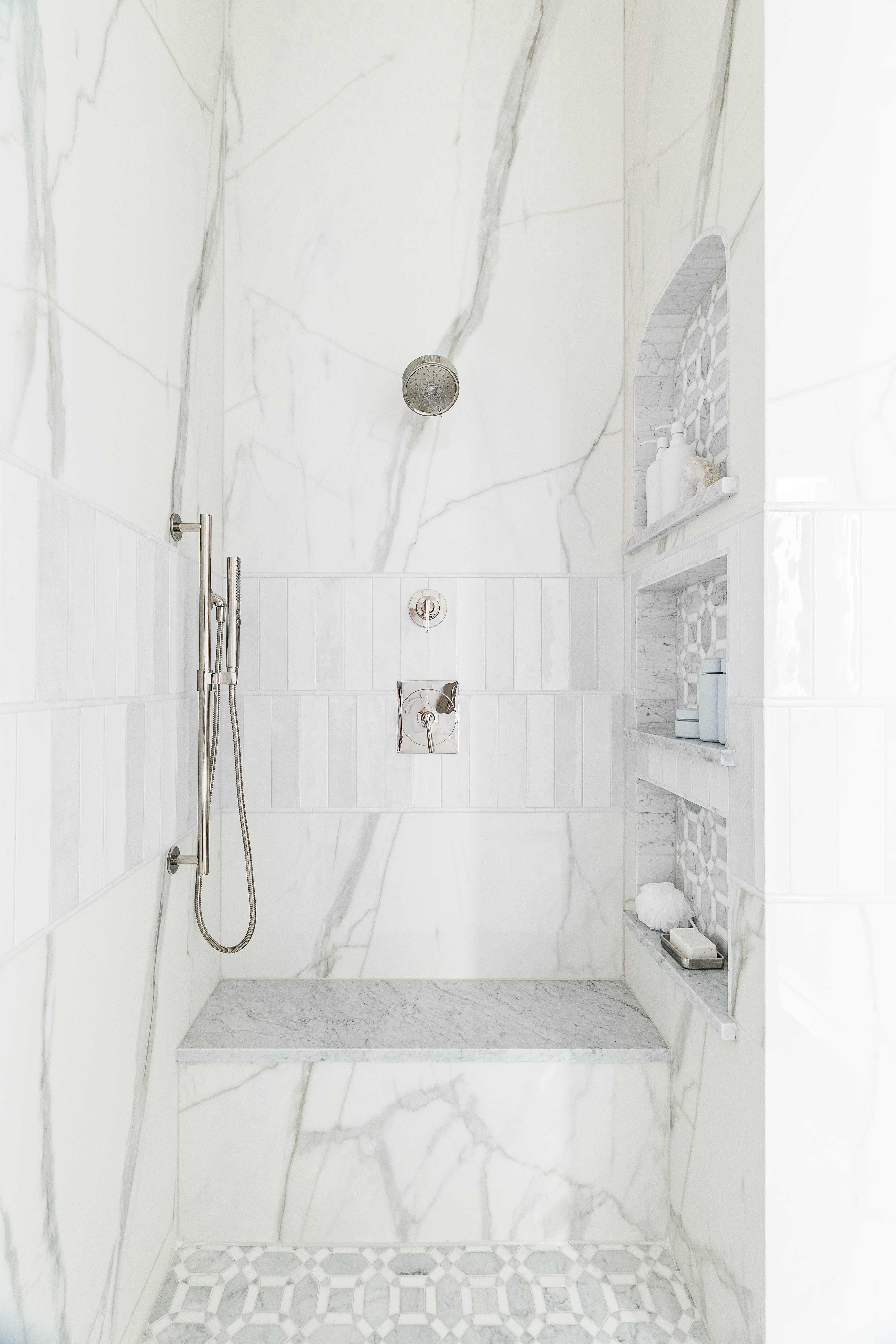 After a sprinkler flood, the primary bathroom was reimagined into a softly luxurious retreat befitting its prestigious neighborhood. The layout stayed, but every finish changed—replacing heavy Tuscan elements with polished porcelain walls, layered lighting, and calming tones. A custom arched shower entry and a continuous 24-inch zellige tile band made the oversized shower feel intentional, while a bespoke marble-topped vanity and a handmade bubble chandelier added tailored, artful elegance.