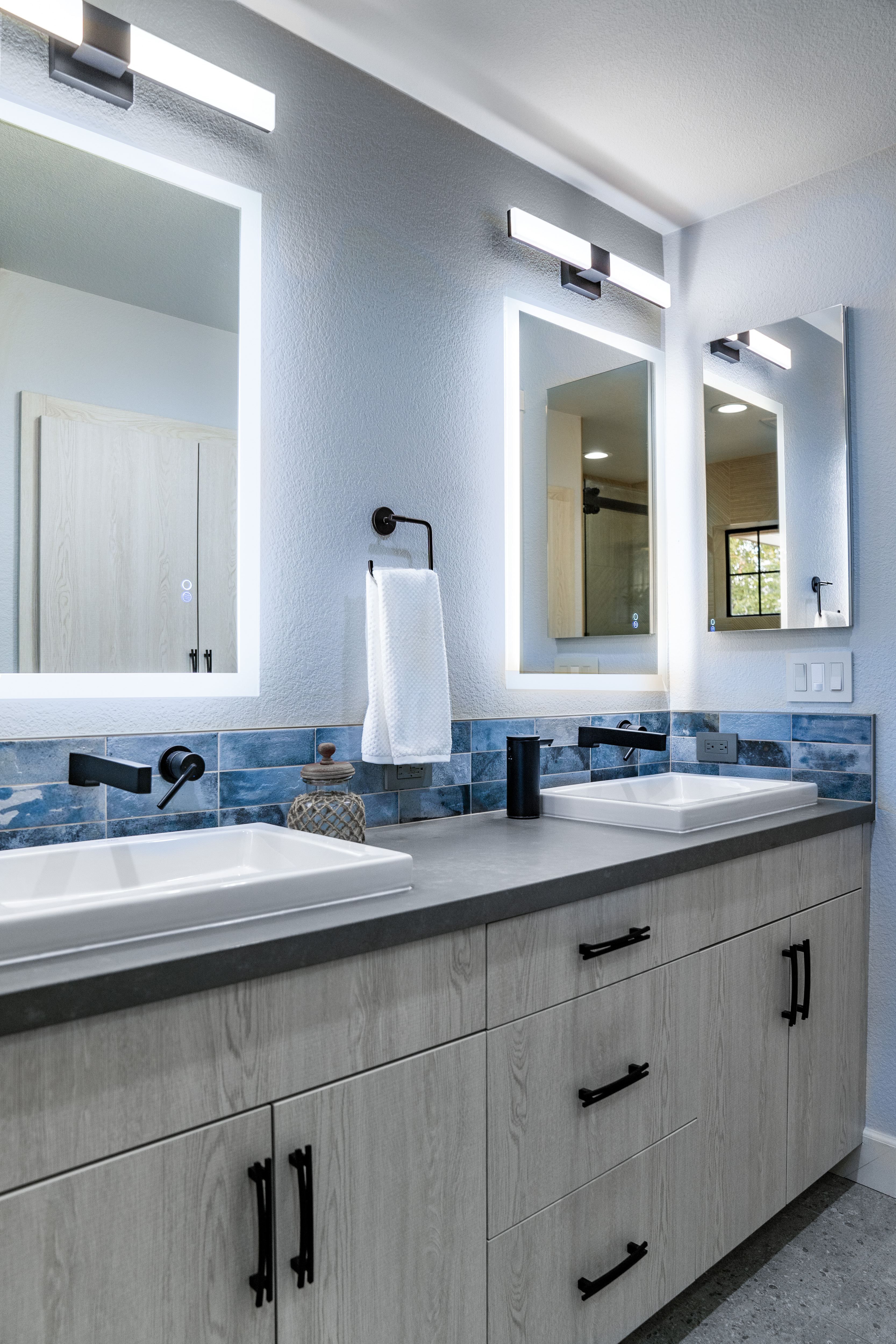 Bathroom, Contemporary, Tile, Sink Faucets, Sinks, Cabinets, Cabinet Hardware and Countertops